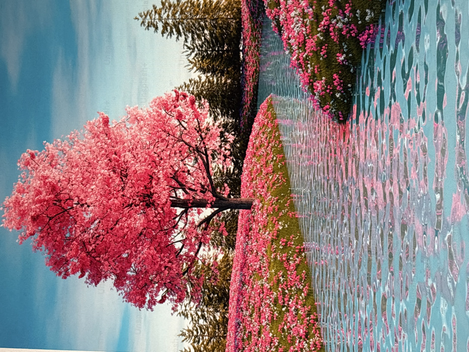 A tranquil scene unfolds featuring a blooming cherry blossom tree with vibrant pink flowers against a blue sky. Adjacent to the tree, a water body reflects the floral landscape, creating a rippling mirror image. Lush green bushes, adorned with small pink and white flowers, line the waterway. Tall evergreen trees provide a darker, contrasting backdrop, enhancing the overall depth and serenity of the composition.