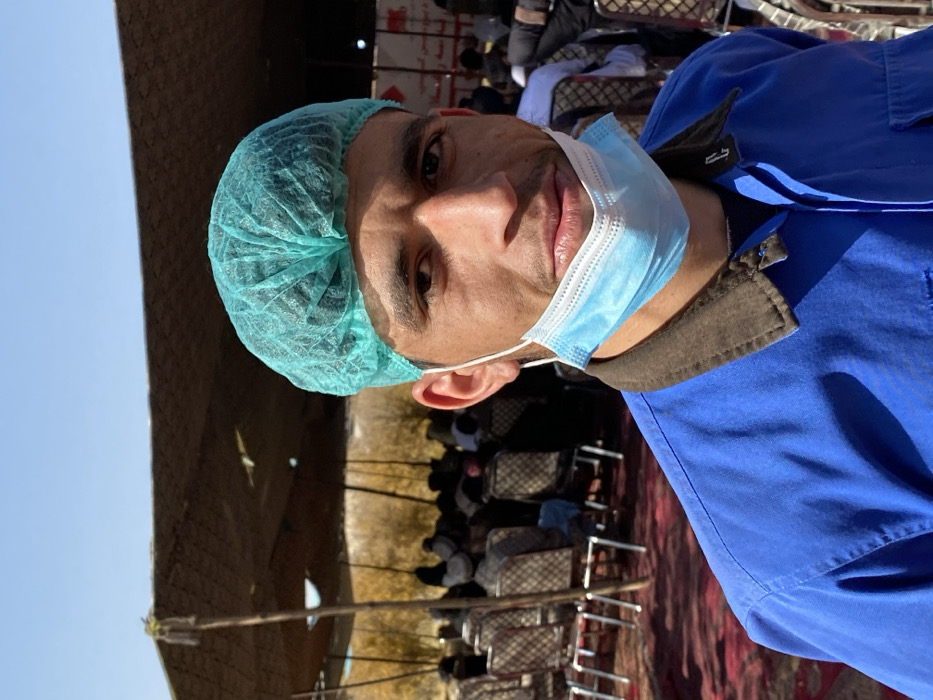 The image displays a close-up of a young adult male in Sard-E 'olya, Afghanistan, against the backdrop of an outdoor gathering. The male subject, centered in the frame, wears a teal disposable bouffant cap, a blue collared shirt with a dark brown collar, and a light blue disposable surgical mask pulled down below his chin. He has dark hair, visible dark eyes, and light stubble on his chin, maintaining a neutral expression. In the midground, under a makeshift tent canopy composed of dark, possibly camouflage-patterned fabric supported by poles, approximately 20-30 individuals are seated in rows of metal-framed chairs with checkered upholstery. The ground within the tent area is covered by a reddish-brown carpet. A red banner with white script is partially visible on the right side of the background. Beyond the tent, under a clear blue sky, sparse, yellowish-brown vegetation is visible, suggesting an arid environment.