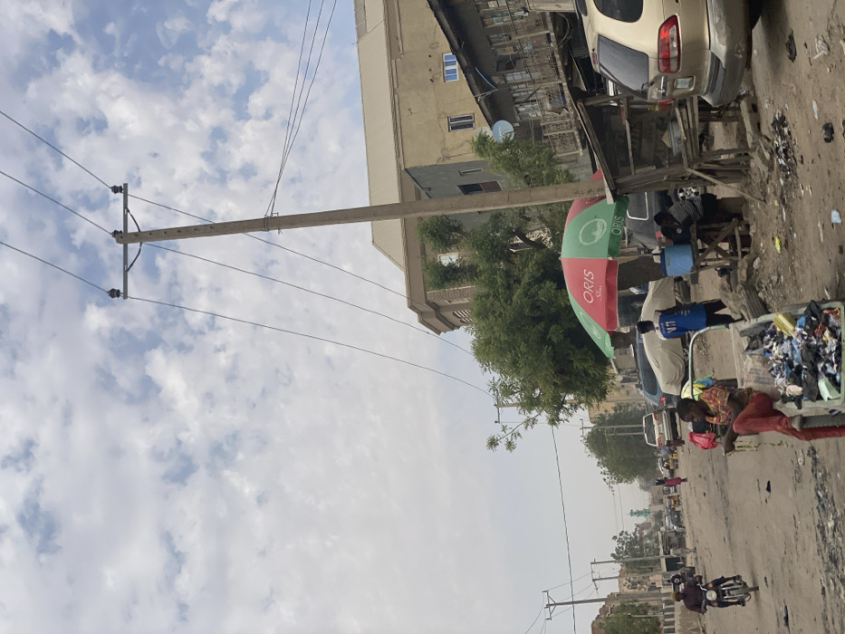 The image portrays a street scene in Sabon Gari East, Nigeria, under an overcast sky with scattered white clouds