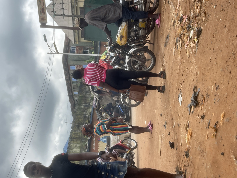 The image depicts an unpaved, reddish-brown dirt road in an urban area of Nnobi, Nigeria, under an overcast sky. Scattered litter, including plastic and other debris, is visible on the ground. In the foreground, on the left, a young individual, possibly male, wearing a black t-shirt with "REANG" visible on the chest and ripped denim shorts, stands facing the camera. His lower legs are cropped from the frame. In the mid-ground, from left to right: * A woman in a colorful, vertical striped dress (green, yellow, red, blue) and pink slide sandals stands facing right, holding a light-colored shoulder bag. * A woman in a pink and white horizontal striped short-sleeved top, black leggings, and black platform sandals stands with her back to the camera, holding a brown leather-like handbag in her left hand. * A man wearing a light grey short-sleeved shirt, blue trousers, and pink slide sandals stands beside a yellow motorcycle, facing left. He wears a light-colored cap. Several motorcycles are parked or in use in the mid-ground and background, including a red one on the left and multiple darker ones further back. Additional individuals are partially visible in the background, some seated on motorcycles. The background features several multi-story buildings, some with blue-tinted windows, and market stall-like structures. Overhead utility wires traverse the upper part of the scene, and a street light pole with a single luminaire is visible towards the right.