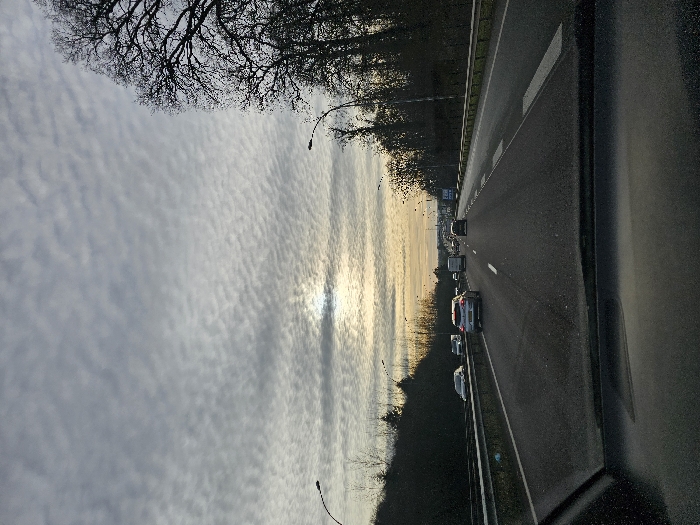 The scene depicts a multi-lane highway in Pontpierre, Luxembourg, viewed from inside a vehicle looking forward through the windshield. The sky is largely covered by patterned, greyish-white clouds, with a diffuse, low-angle light source, presumed to be the sun, visible centrally. Dense, primarily bare deciduous trees line both sides of the highway, behind metallic guardrails. Two streetlights with curved standards are visible in the foreground, one on each side of the road. The highway features at least two lanes of traffic in the direction of the camera's travel, separated by white dashed lines, and at least one opposing lane, separated by a median barrier. Vehicles are present in both directions. In the foreground's direction of travel, a light-colored hatchback with illuminated brake lights occupies the left lane, with several other passenger cars and a white van visible further down the road. The road surface is dry. No individuals are discernible within the vehicles or the surrounding environment.
