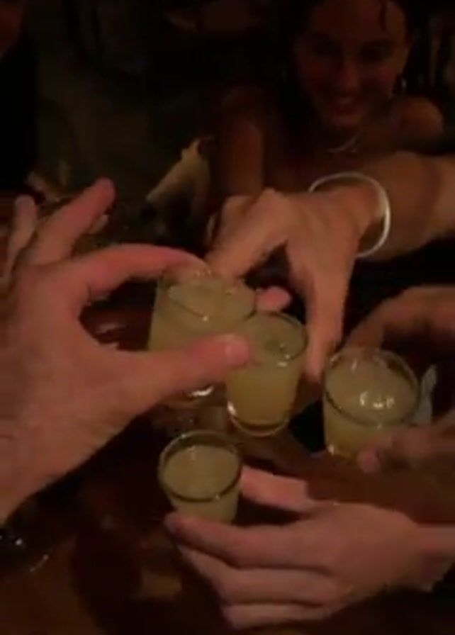 A group of people are toasting with small glasses of a yellow liquid, possibly shots, at a wooden table in what appears to be a dimly lit bar or restaurant