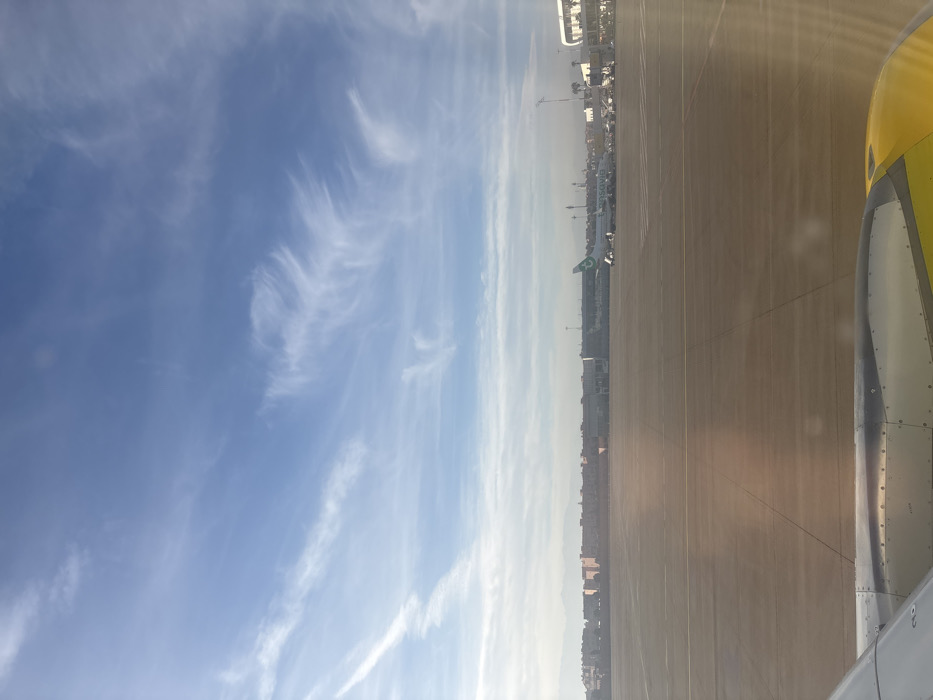 The image depicts an airport tarmac scene under a clear blue sky with sparse, wispy cirrus clouds, indicative of Marrakesh Menara Airport (RAK) in Marrakesh, Morocco. The perspective is from inside an aircraft, with the lower portion of a yellow and metallic silver engine cowl and wing visible in the foreground, extending from the bottom left to the lower right. The midground features a vast expanse of dark grey asphalt or concrete tarmac with light-colored painted markings, including taxiway lines. Sunlight reflects off the tarmac surface, creating subtle glare. In the background, positioned across the horizon, are various elements: * To the left, beyond the airport perimeter, are low-rise urban buildings, likely residential or commercial structures, with a hazy, indistinct mountain range visible in the far distance (consistent with the Atlas Mountains). * Central to the background is an airport apron area with a prominent green and white passenger aircraft, possibly a Transavia Boeing 737, parked at a gate. Around this aircraft, several pieces of ground support equipment and other vehicles are visible, though specific details are indistinct due to distance. * To the right, further airport infrastructure, including sections of terminal buildings and jet bridges, can be observed. No individual people or specific actions are discernible within the frame. The scene conveys a quiescent moment on an active airfield under bright daylight conditions.