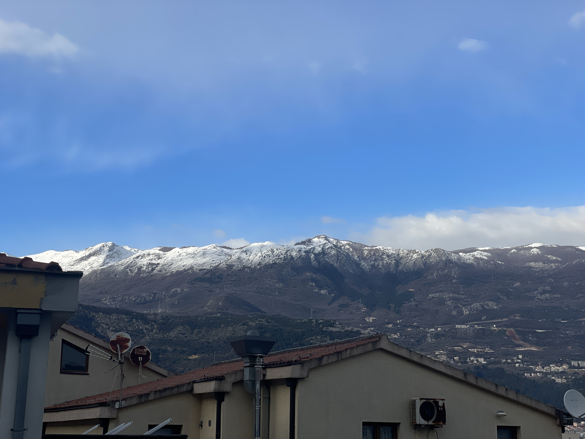 The image depicts a panoramic view of snow-capped mountains under a partially cloudy blue sky, observed from an elevated position within the city of Budva, Montenegro. In the foreground, the upper portions of several residential buildings with terracotta-tiled roofs are visible. Specifically, the sky is clear blue with scattered, wispy white clouds at various altitudes. A prominent mountain range dominates the background, with its peaks heavily covered in white snow. The lower slopes of these mountains are dark, appearing rocky and sparsely vegetated with deciduous trees or shrubs, showing hints of exposed earth and rock formations. Numerous small structures and signs of development, including terraced areas and distant buildings, are discernible on the middle and lower mountain slopes, indicating urban or semi-urban expansion. In the immediate foreground, from left to right: - The corner of a light-colored building with a terracotta-tiled roof and a gray downspout is visible on the far left. - Adjacent to it, a tan-colored building features a dark-framed, angled window. Mounted on its terracotta roof is a rusted antenna array and two circular, heavily rusted satellite dishes. - Further to the right, another tan-colored building displays a modern, polished metallic chimney stack rising from its terracotta roof. - On the far right, part of a tan-colored building with a terracotta roof is visible, featuring an exterior-mounted LG-branded air conditioning unit and a partially visible white satellite dish. No people are present in the scene, and no specific actions or interactions are depicted. The lighting suggests daytime conditions.
