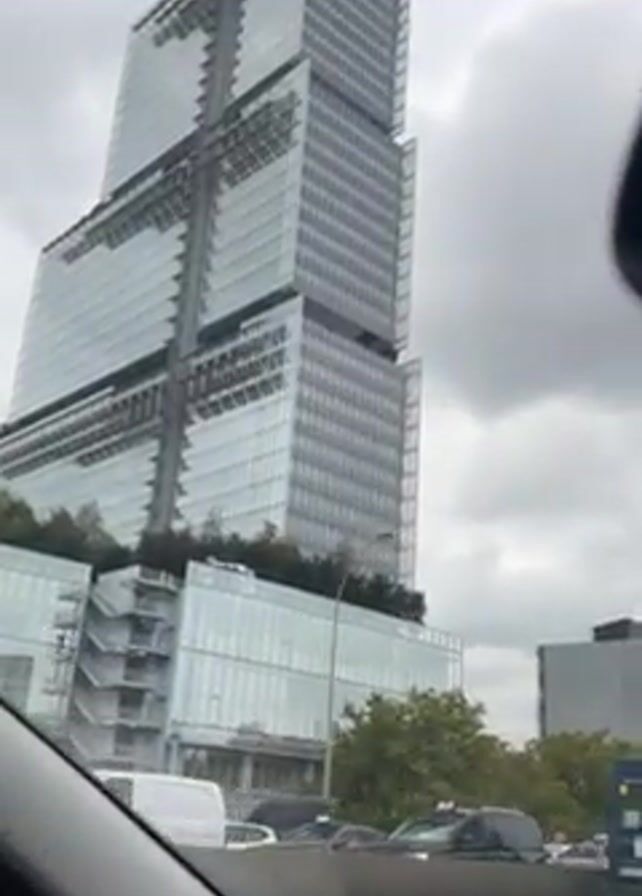 car driving on a highway or freeway. The view is from inside the car looking forward. The car is passing a tall, modern skyscraper with a stepped design and lots of glass. There are other cars and vans on the road. The sky is overcast. The video captures the movement of the car and the surroundings.