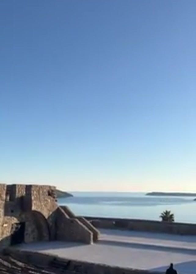 The camera pans across a stone amphitheater, partially in shadow. The seats are visible in the foreground. A person in a dark jacket walks along the paved area above the seats, stopping near the edge. Beyond the amphitheater, there is a clear blue sea, with land masses visible on either side and a small island in the center. A lone palm tree is also visible near the edge of the amphitheater. The sky is cloudless and bright blue.