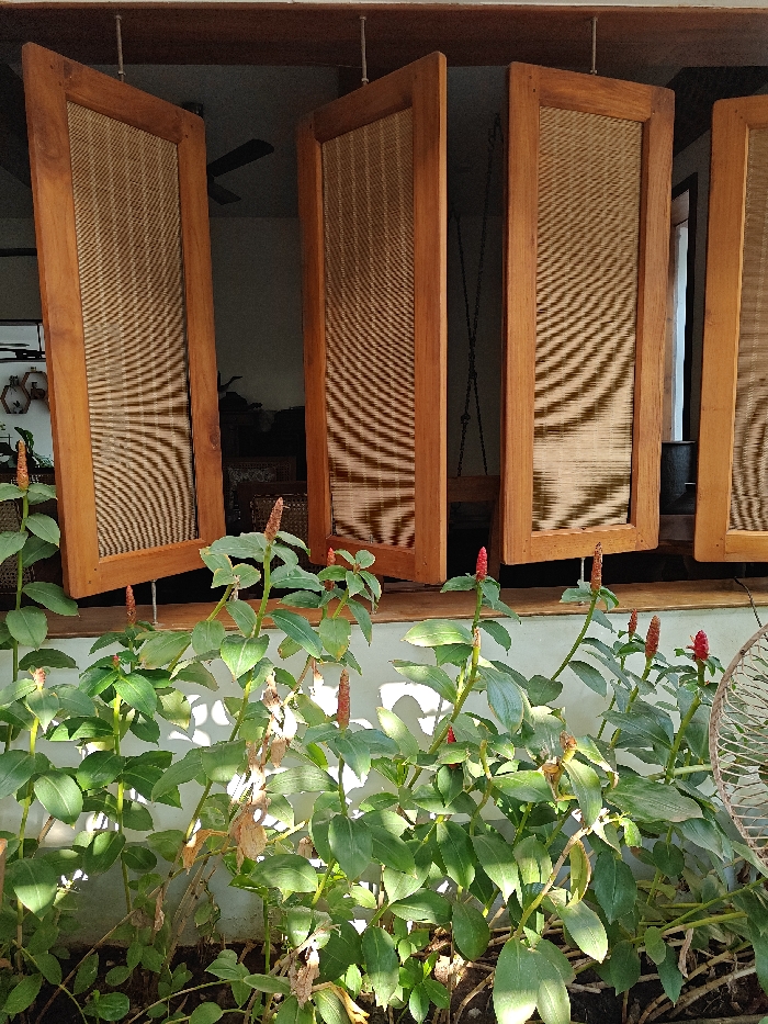 The image depicts an outdoor perspective of a building in Alappuzha, India, focusing on a window or an open architectural section. The foreground is dominated by a dense arrangement of green leafy plants with distinctive reddish-orange, conical flower spikes, consistent with Indian Head Ginger (Costus speciosus). These plants are situated against a light-colored wall, illuminated by direct sunlight, which casts distinct shadows. A small, light-colored, woven object, possibly part of a fan or decorative screen, is partially visible on the far right. Above the plants, four vertically oriented rectangular panels, constructed with dark wooden frames and woven cane or rattan inserts, are partially open. These panels are suspended from an overhead wooden beam by thin metal rods and chains, indicating a pivoting or louvred design. Through the gaps between the open panels, a dimly lit interior space is discernible. A dark ceiling fan is partially visible in the upper left of the interior, and indistinct furniture, possibly including elements of wood and cane, can be faintly observed in the deeper background. A dark chain, suspended from above, is visible between the second and third panels from the left.