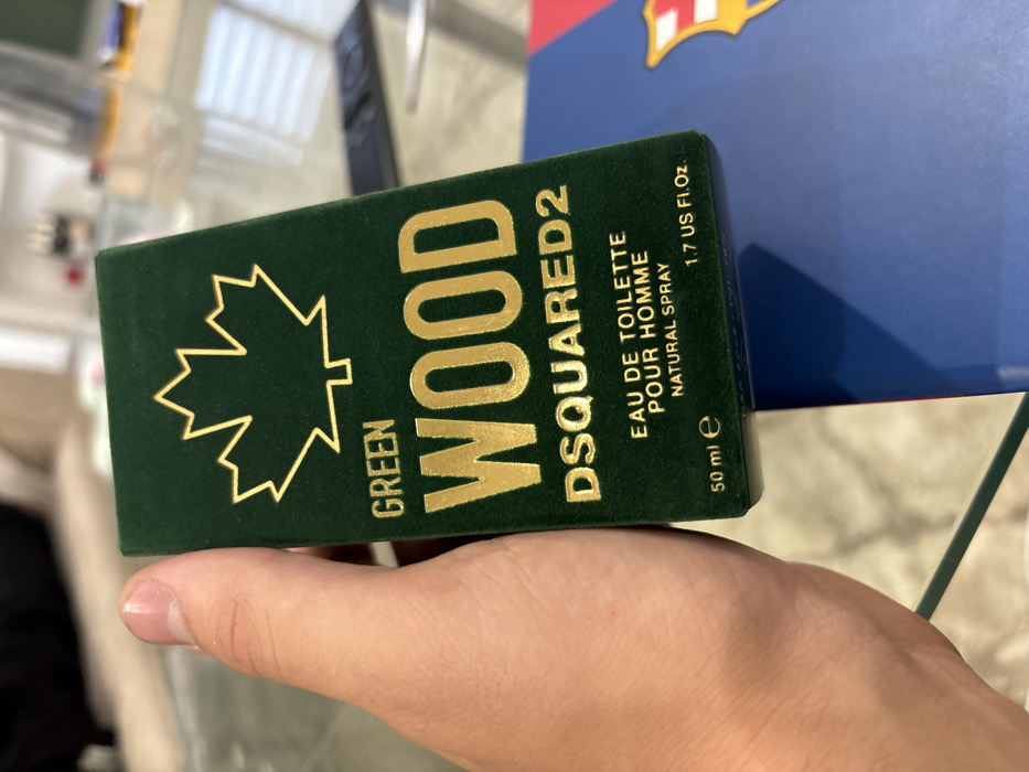 A close-up, high-angle indoor photograph captures a human left hand holding a dark green velvet-textured cardboard box. The box, oriented vertically, displays gold-foiled text: "GREEN WOOD" beneath a gold outlined maple leaf symbol, followed by "DSQUARED2," and "EAU DE TOILETTE POUR HOMME NATURAL SPRAY." The base of the box indicates "50 ml e" and "1.7 US Fl.Oz." The thumb and part of the index finger of the hand are visible, gripping the sides of the box. The immediate background consists of a clear glass table surface. Beneath the perfume box, a blue object is partially visible, featuring a portion of the distinctive red, yellow, and blue FC Barcelona crest. The deeper background is heavily blurred but indicates an indoor environment, likely a domestic residence. Indistinct shapes suggest other household items, including a black remote control and possibly soft furnishings or additional decorative objects. The lighting is consistent with ambient indoor illumination. This scene is located in a residential setting in Sofia, Bulgaria.