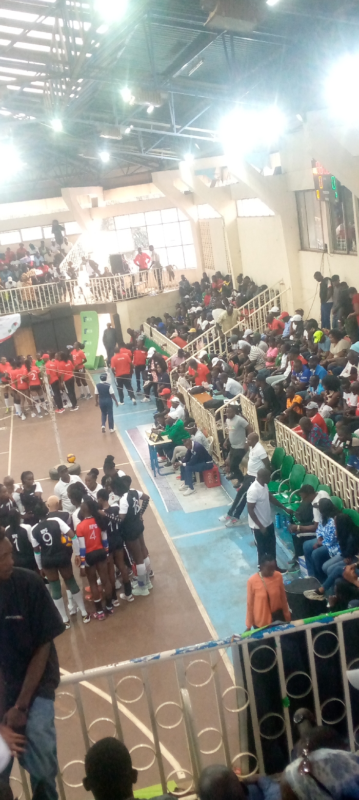 An indoor volleyball game is in progress, with spectators filling the stands. Two teams, one in red and the other in black, are positioned on the court. A score board can be seen at the back, in front of the crowd. Additional people are standing or sitting in the vicinity of the court. The environment appears to be a gymnasium or a similar indoor sports venue.