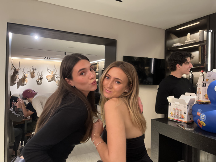 Two women pose closely, one with puckered lips. Both are dressed in black. A man stands in the background near a counter with beverage boxes and a large blue rubber duck. Behind the women, mounted animal heads decorate a wall above a seating area. A dark-colored television is visible behind the man. There is a tall dark shelf behind the man, with various decorative objects on it.