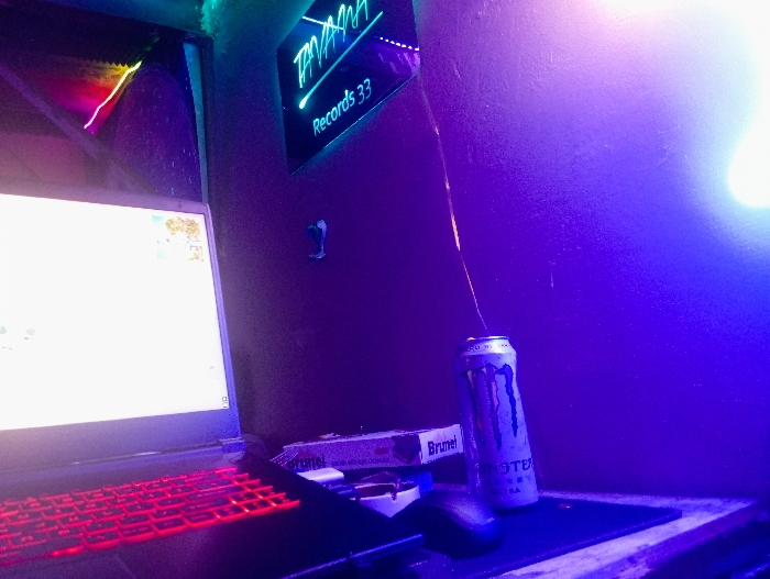 An indoor scene, located in Smolyan, Bulgaria, depicts a workstation illuminated primarily by artificial purple and blue light. In the foreground, a black laptop with a red backlit keyboard is open, displaying a bright white screen with faint visual content. To the right of the laptop, a black computer mouse rests on a dark mousepad. A silver Monster Energy Zero Sugar branded can stands upright next to the mouse. Behind the can, a thin, light-colored string or wire extends vertically upwards. A pack of Brunel cigarettes is positioned near the mouse and energy drink can. On the dark wall in the background, a light blue neon sign is affixed, displaying the text "TATATA Records 33." A small, light-colored object, possibly a hook, is attached to the wall below the sign. An additional light source in the upper left corner emits a rainbow spectrum of colors, reflecting off a nearby surface. No individuals are visible.