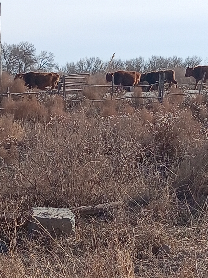This image depicts a rural landscape in Chimbay, Uzbekistan, under a pale, clear sky. Five brown cattle are observed moving from left to right across the midground, positioned behind a rustic wooden fence constructed from natural branches and posts. The cattle exhibit varying degrees of visibility due to the fence and dense, dry, brown scrub brush and tall grasses that dominate the immediate foreground. In the lower-left quadrant of the foreground, a grey, rectangular concrete block is partially embedded within the dry vegetation, with a dark log or thick branch lying horizontally adjacent to it. A line of bare deciduous trees stretches along the horizon in the background. No human presence or specific interactions are discernible. The environment suggests an arid or semi-arid region during a dormant vegetation period.