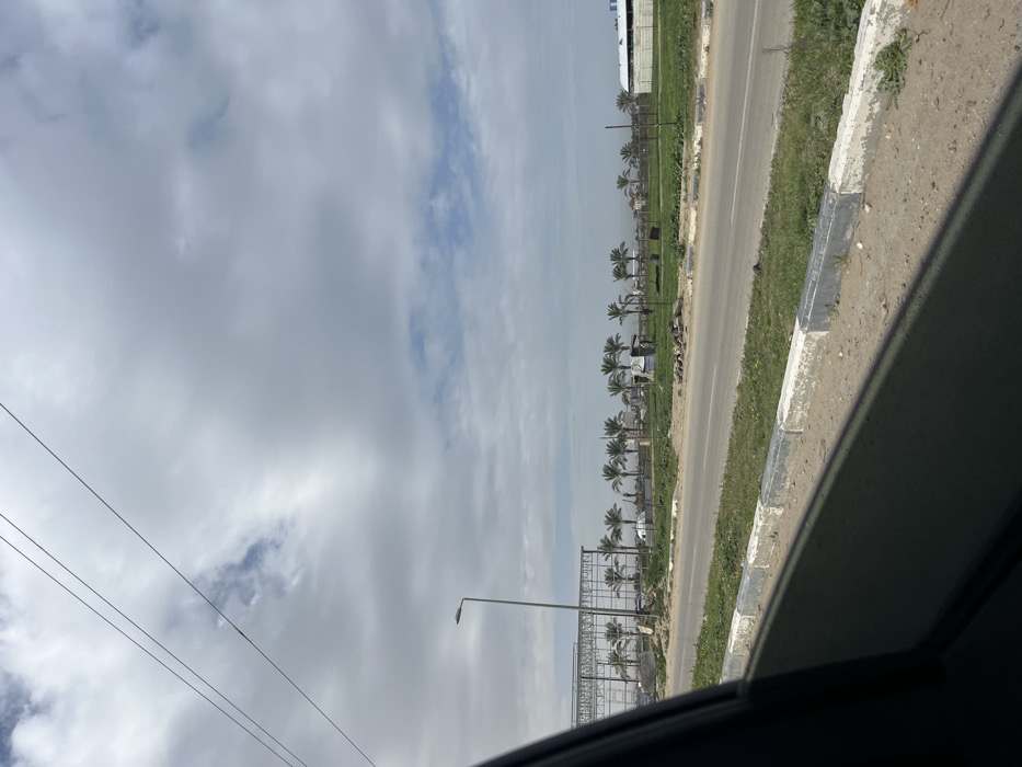 The image presents an outdoor scene captured from a vehicle, offering a view of a roadside environment in the city of Unknown, Palestinian Territory