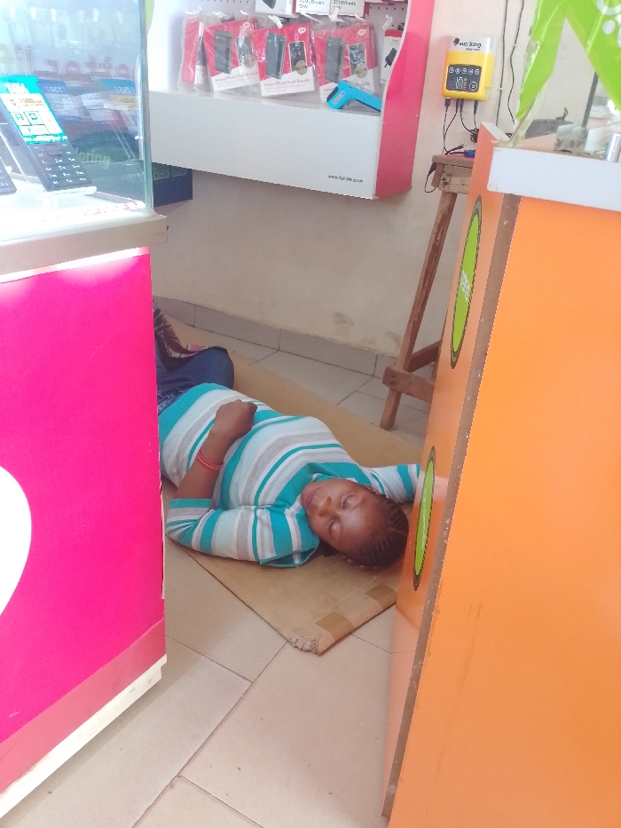 The image depicts an indoor scene within a retail establishment, likely a mobile phone or electronics store, located in Sabon Tasha, Nigeria. A female individual, identified by her braided hair and attire consisting of a light blue and white striped long-sleeved shirt and dark blue trousers, is lying on her right side on a piece of cardboard placed on a light-colored tiled floor. Her eyes are closed, indicating a state of rest or sleep. A red bracelet is visible on her right wrist. Her right arm is bent with her hand near her abdomen, while her left arm is extended upwards. To the immediate left foreground, a bright pink display unit with a transparent glass top showcases several mobile phones or similar electronic devices. The glass reflects numerals and text. To the immediate right foreground, an orange display partition stands vertically, featuring two circular green logo decals. In the background, a light-colored wall serves as the backdrop for a white retail display shelf unit. This shelf unit presents multiple packaged electronic accessories, predominantly in red packaging, labeled as "Power Pack" or "Power Bank." A blue electronic device is also visible on the shelf. The website "www.bigi-lite.com" is printed on the lower fascia of this shelf unit. Mounted on the wall above a wooden stool, a yellow device labeled "BIG KING" is visible, featuring multiple ports, indicator lights (green, red), and a central yellow button/dial, with cables connected to it. The environment is illuminated, and the floor consists of square, light-colored tiles.
