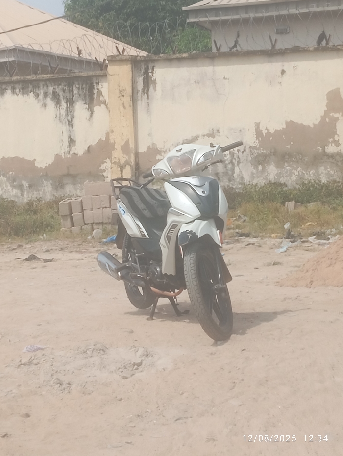 - "The image depicts a white and black underbone-style motorcycle, parked on a light brown, dusty dirt surface under a hazy sky in Lokoja, Nigeria" by FM-G1uZ22, licensed under CC BY 4.0