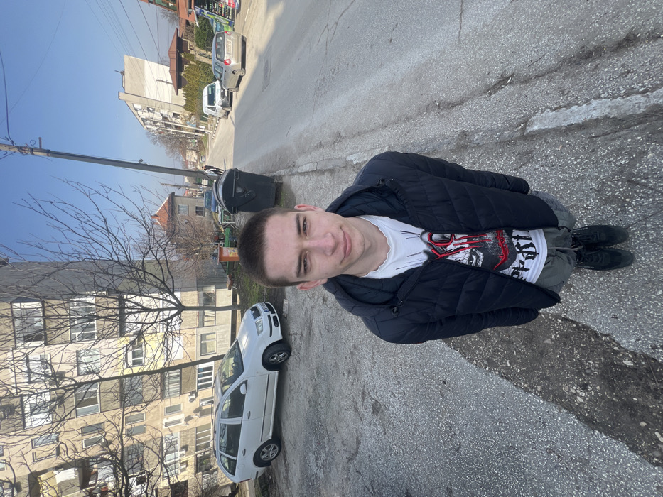 A young male, observed from a low angle, stands centered in the foreground of an urban street scene in Cherven Bryag, Bulgaria. He has short, dark hair and a neutral expression with a slight smirk. He wears a dark blue quilted puffer jacket over a white t-shirt featuring a red and black graphic design, grey pants or shorts, and dark shoes. To his left, a white Skoda Fabia station wagon is parked on a paved area adjacent to a multi-story, light-colored apartment building with numerous windows and balconies. Several bare trees are positioned between the vehicle and the building. To his right, a worn asphalt street extends into the distance, with a sidewalk or shoulder running alongside it. A black waste bin is situated near the sidewalk. A wooden utility pole rises prominently from the right side of the frame. Further down the street, additional residential buildings with tiled roofs and another multi-story structure are visible. A white van and other vehicles are present on the street. The sky is clear and blue. The ground in the immediate foreground consists of cracked asphalt and concrete with some dirt and debris.
