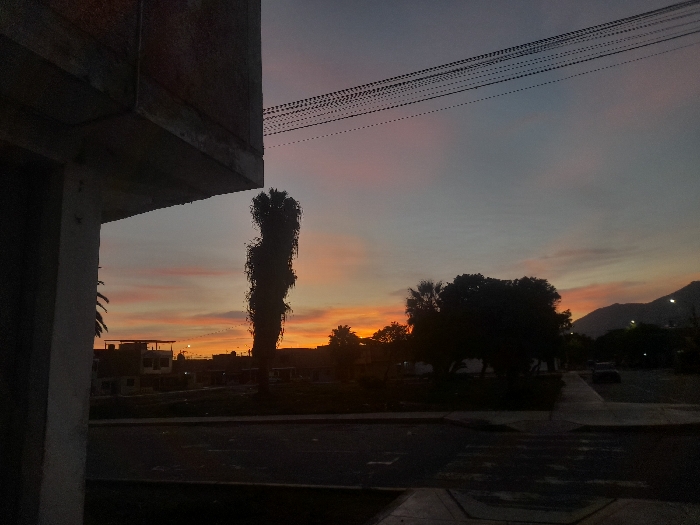A captivating sunset dominates the sky with hues of orange and pink, partially obscured by electrical wires. Silhouetted trees, including a tall, slender one, stand against the colorful backdrop. Houses are dimly visible in the distance. The foreground features an asphalt road and a portion of a building structure, adding depth and framing the scene. A mountain is faintly visible on the right side of the frame.