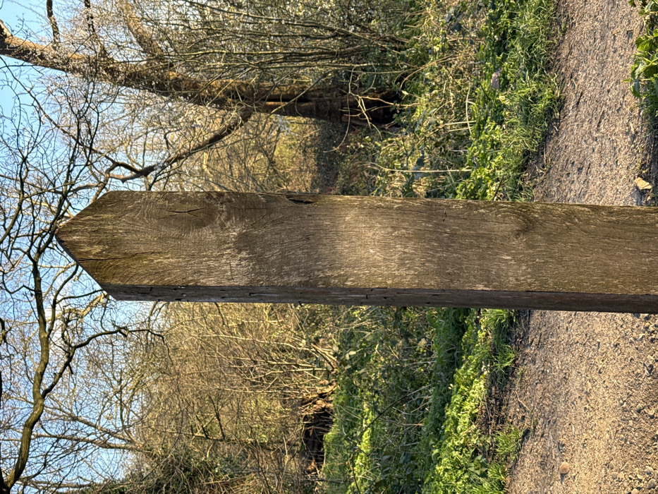 The image displays an outdoor scene within a natural park or wooded area in London, United Kingdom. In the central foreground, a weathered, rectangular wooden post stands vertically, featuring a pointed, pyramidal top. The post's surface is rough and textured, exhibiting visible wood grain, minor cracks, and discolouration consistent with exposure to elements. Direct, low-angle sunlight illuminates the right side of the post, casting warm tones. A light brown, granular dirt or gravel path curves from the lower-left corner of the frame, passing behind the wooden post and continuing towards the right, slightly uphill. The ground immediately surrounding the path and extending into the mid-ground is covered with dense green undergrowth, consisting of various low-lying plants and grasses. The background features a thick arrangement of deciduous trees with mostly bare branches, suggesting a late winter or early spring season. Some trees, particularly on the right side, show signs of very early budding or faint white blossoms. A clear, pale blue sky is visible through the upper tree canopy. The scene is devoid of human or animal subjects, actions, or interactions.