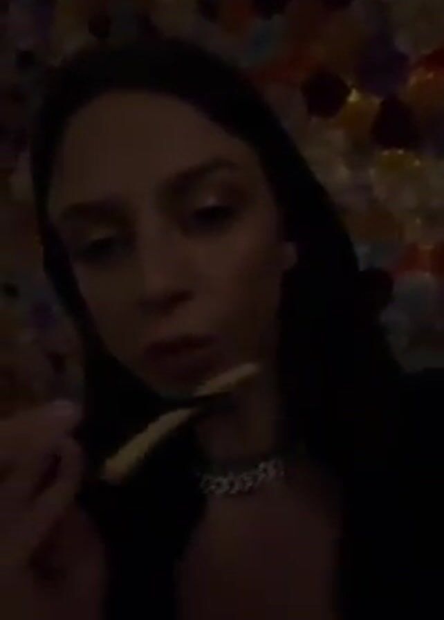 A young woman is shown eating a french fry. She is wearing a black top and a metal chain necklace, with her hair down. She places a french fry in her mouth, chews, and appears to be speaking, although the words are indecipherable due to loud background music. Behind her is a colorful flower display.
