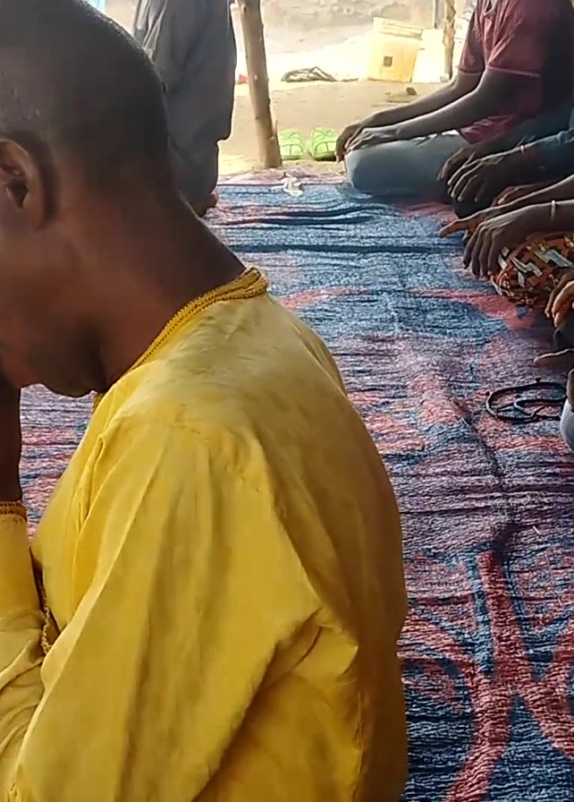 A group of men and a child are sitting on a blue patterned rug, likely outside, as suggested by the background which includes parts of buildings, objects, and the sandy ground. The people are sitting with their knees bent and hands resting on their legs, indicating they may be waiting or engaging in a seated activity. Most of the men are looking forward, and the man at the front of the group is touching his mouth with his hand. The attire of the people varies; some wear traditional-looking clothing, while others are dressed in more contemporary outfits.