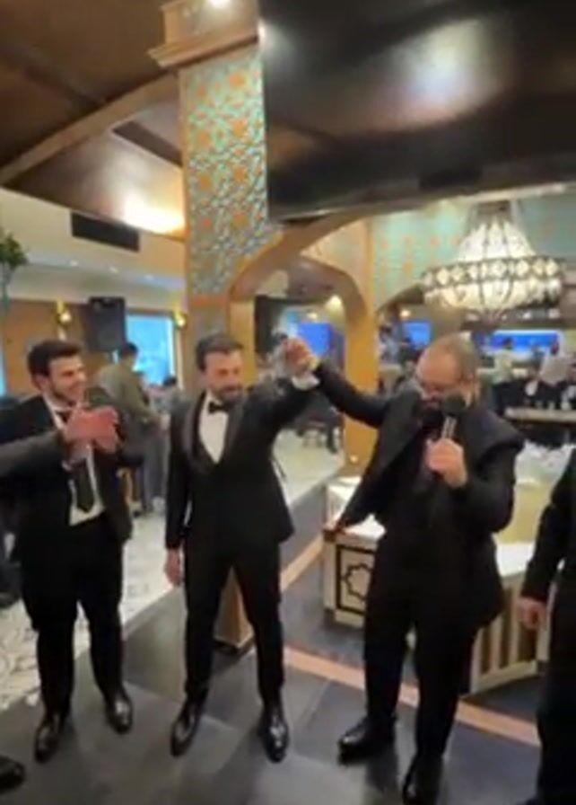 three men in suits dancing at what seems to be a wedding reception. The man in the center wears a tuxedo with a bow tie and dances with raised arms. The man to his right, also in a suit, holds a microphone and has a hand on the dancer's shoulder. Another man claps on the left. The location is a restaurant with ornate decorations, a large television screen, and other patrons visible in the background.