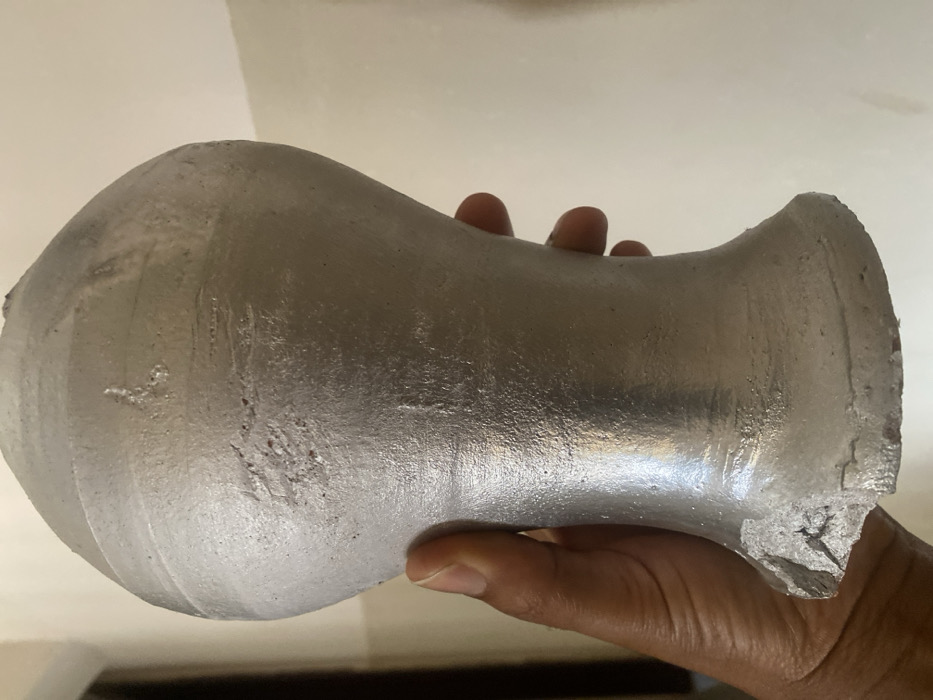An indoor scene, presumably located in Kugbo, Nigeria, depicts a single silver-colored metallic object held by a human hand. The object, roughly vase-shaped, features a bulbous upper section, a narrower mid-body, and a flared base that exhibits a significant fracture with a rough, irregular edge. The surface of the object is textured, showing visible horizontal striations and minor surface imperfections. A person's hand, characterized by a medium-dark skin tone, grips the object from its left side. The background consists of an indistinct, light-colored wall.