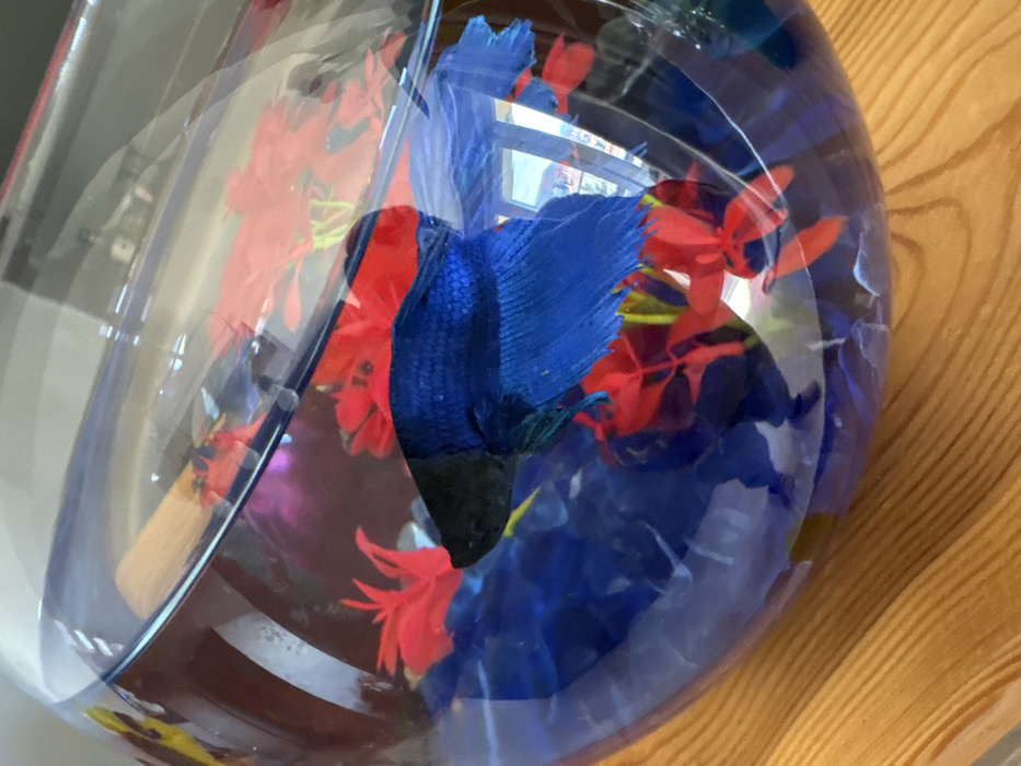 An indoor scene in Lozen, Bulgaria, depicts a spherical glass fishbowl resting on a light-colored wooden surface. The bowl contains water, blue decorative gravel, and several clumps of red artificial aquatic plants. A single Betta fish (Siamese fighting fish), identifiable by its dark blue body, black head, and vivid blue fins, is observed within the water. The curved glass surface displays reflections of the immediate indoor environment, including what appears to be a window or doorway admitting ambient light, and a light-colored wooden rod or stick.