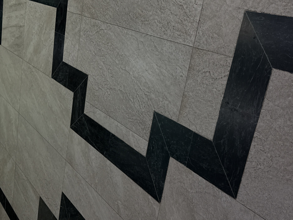 The image displays a tiled floor located in Santa Lucía, Mexico, captured from an elevated perspective. The floor is composed of rectangular tiles of uniform size, laid with visible grout lines. Two distinct color tones are present: a dominant light grey-beige featuring a textured, matte surface, and a darker charcoal grey to black, appearing to have a smoother finish with subtle veining. The darker tiles are arranged to form a continuous, angular zigzag pattern that traverses the lighter background tiles from the lower-left to the upper-right quadrant of the frame. No individuals, objects, or actions are depicted within the scene.