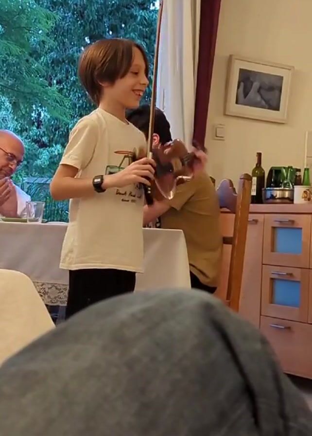 A young boy is performing with a violin in a home setting. He's wearing a white t-shirt with a vehicle illustration and dark shorts. He has short brown hair and a wide smile as he holds his violin and bow. A man with glasses sits at a table to the left, clapping in appreciation. Behind the boy is a partial view of another person seated at the table. The room appears to be a dining area adjacent to a kitchen, as suggested by the countertop with bottles and jars. A large window with a garden view is visible. The camera's perspective is from the lap of someone seated, wearing blue jeans. Artwork is on the wall behind the boy, and the overall atmosphere is warm and familial. The boy receives applause after finishing his performance.