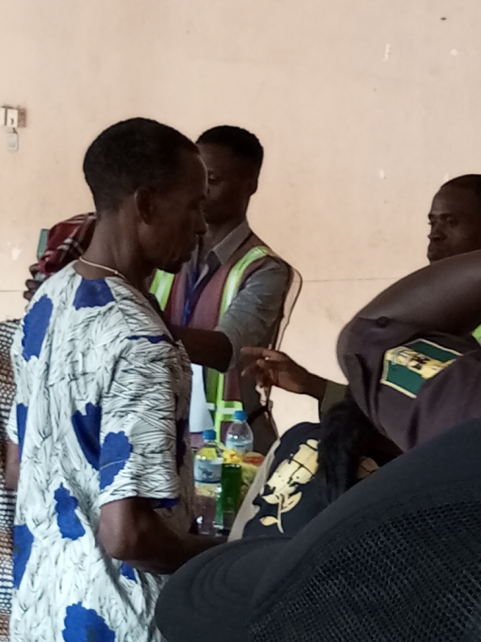 This image captures an indoor scene in Ajalli, Nigeria, featuring multiple individuals gathered in what appears to be a light-colored room. In the foreground left, a man with short dark hair is depicted in profile, facing right. He wears a white and blue patterned short-sleeved top and a thin, light-colored necklace. His right arm is partially visible. Behind him, a fragment of another individual wearing a red and white patterned garment is visible. In the mid-ground, slightly behind the first man, another man with short dark hair stands in profile, facing right. He wears a light grey collared shirt under a red vest with prominent yellow-green reflective stripes. A dark lanyard is visible around his neck. To the mid-right, the right side of a third man's face and shoulder are visible. He looks towards the left and wears a dark top with a rectangular green and yellow patch on the upper left sleeve. Below him, a dark-skinned hand extends into the frame from the right, with fingers slightly curled, appearing to gesture. Adjacent to this, a black fabric with a beige or yellow floral design is partially visible. On a surface in the mid-ground, likely a table, several items are present: two full clear plastic water bottles with blue caps, one partially full clear plastic water bottle with a blue cap, and one plastic bottle containing a yellow liquid. A green cylindrical object, possibly a cup or bottle, is also visible. The background consists of a plain, light beige or cream-colored wall. A white rectangular object, possibly a light switch or electrical outlet, is affixed to the upper left portion of this wall. A dark mesh cap is partially visible in the extreme foreground, lower right. The individuals appear to be engaged in a gathering or discussion.