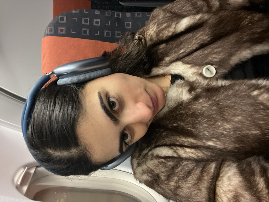 A woman poses in a sideways photo wearing blue headphones and a fur coat with a button. She is sitting in an airplane seat with an orange headrest and patterned dark blue and gray seat. Her hair is dark and partially obscures the headphones. She is looking directly at the camera with a slight smile. The interior of the airplane is visible.
