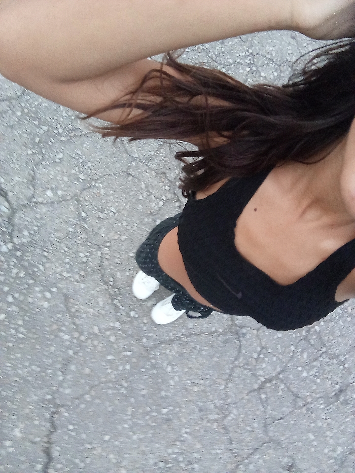 From an overhead perspective, a woman with long, dark hair is seen wearing a black sports bra and leggings. Her skin is visible between the bra and leggings. She is wearing white sneakers. The ground is cracked asphalt or concrete. The woman's arm is raised above her head on the left side of the frame. A small mole is visible on her chest.