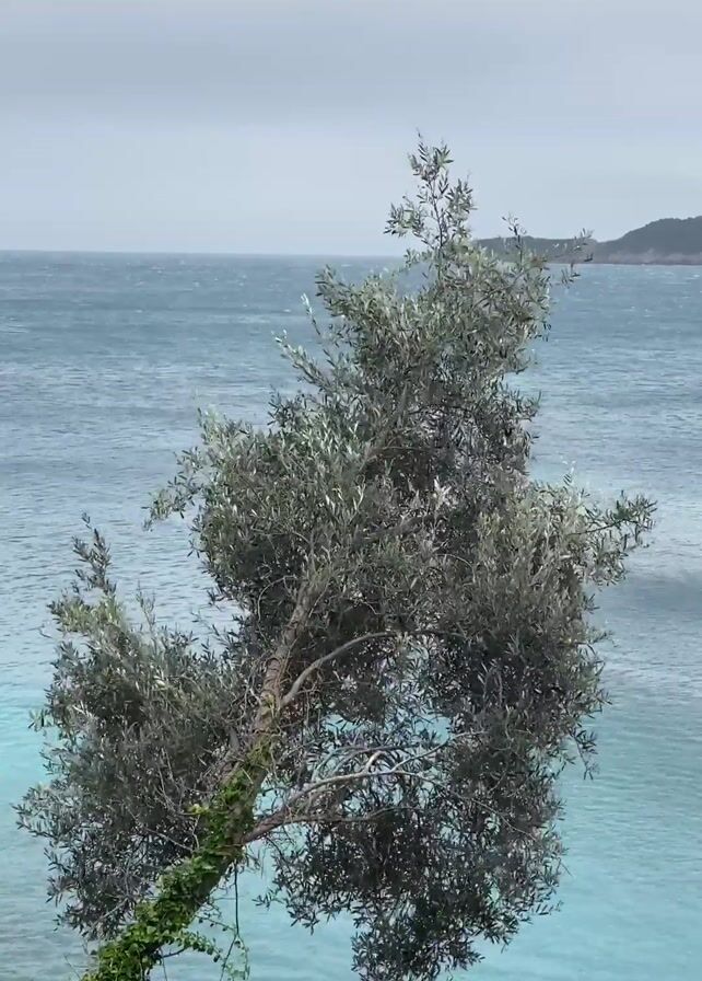 tree growing from a cliff overlooking the ocean on an overcast day. The tree's trunk is at an angle, and it is covered in green vines. The ocean is a mix of turquoise and deeper blue tones, with small waves visible. In the background, there is a landmass in the distance. The sky is grey and overcast.