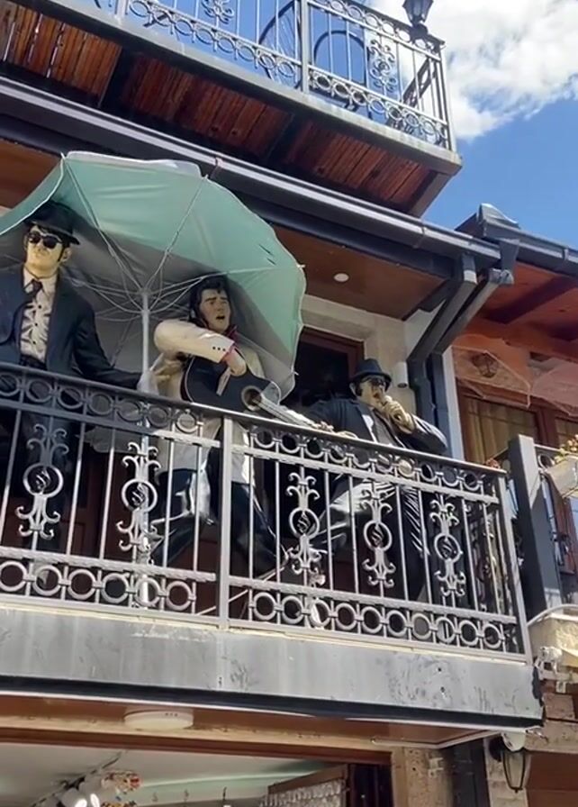 The camera pans across a charming European street scene on a bright sunny day. On a second-story balcony, three mannequins are dressed as musicians. One has an umbrella. Below, a pizzeria called "Pizzeria Dede" is open, and people are sitting at tables. Two men greet each other warmly on the sidewalk in front of the restaurant. Shops with awnings line the pedestrian street. The sky is blue with puffy white clouds.