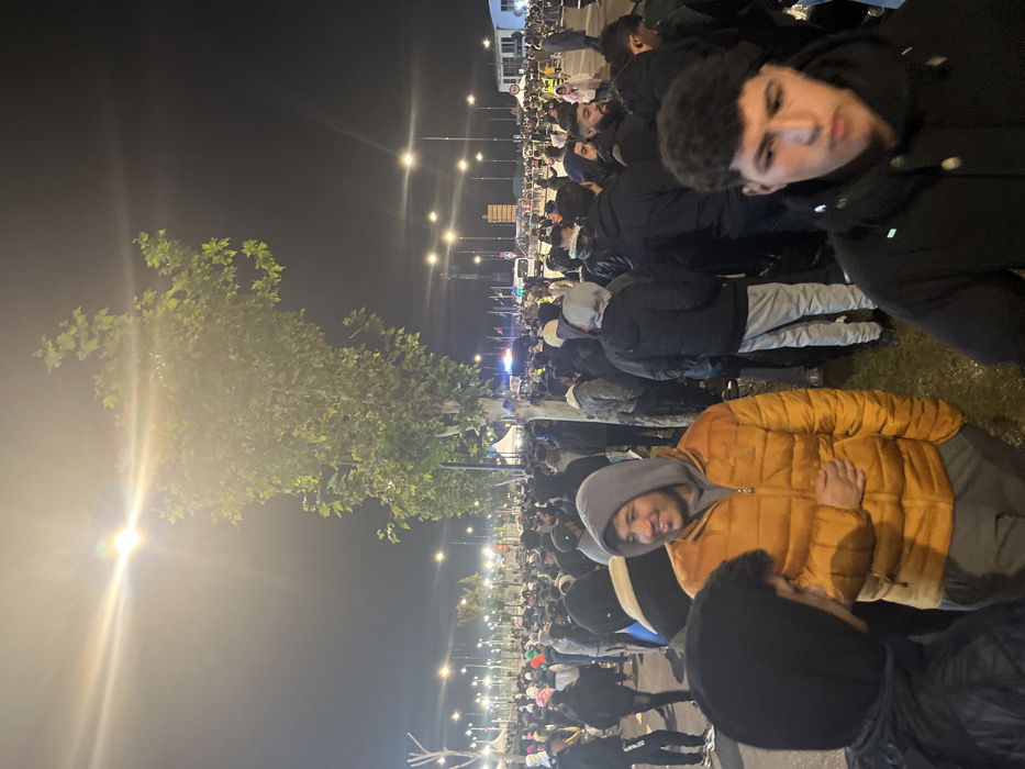 A nighttime gathering of people, illuminated by streetlights. A tree with green leaves stands to the left. A white vehicle with flashing blue lights is visible in the background. In the foreground, people are wearing jackets and hoodies. Two young men are prominently featured, one in a mustard-colored jacket and the other in a black jacket. They are positioned in the foreground, closer to the viewer.
