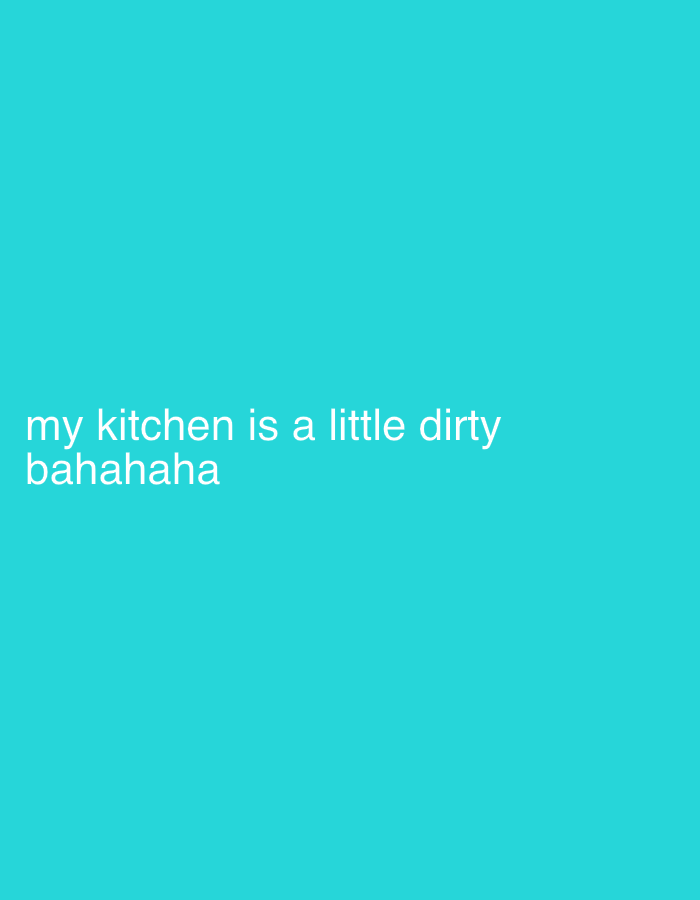 The image displays a uniform, solid teal-colored background. White, sans-serif text is centrally aligned and positioned in the lower portion of the frame. The text reads: "my kitchen is a little dirty bahahaha". No other subjects, objects, or environmental elements are present. The image does not contain any visual or textual information to indicate a specific physical location in the city of València, Spain.