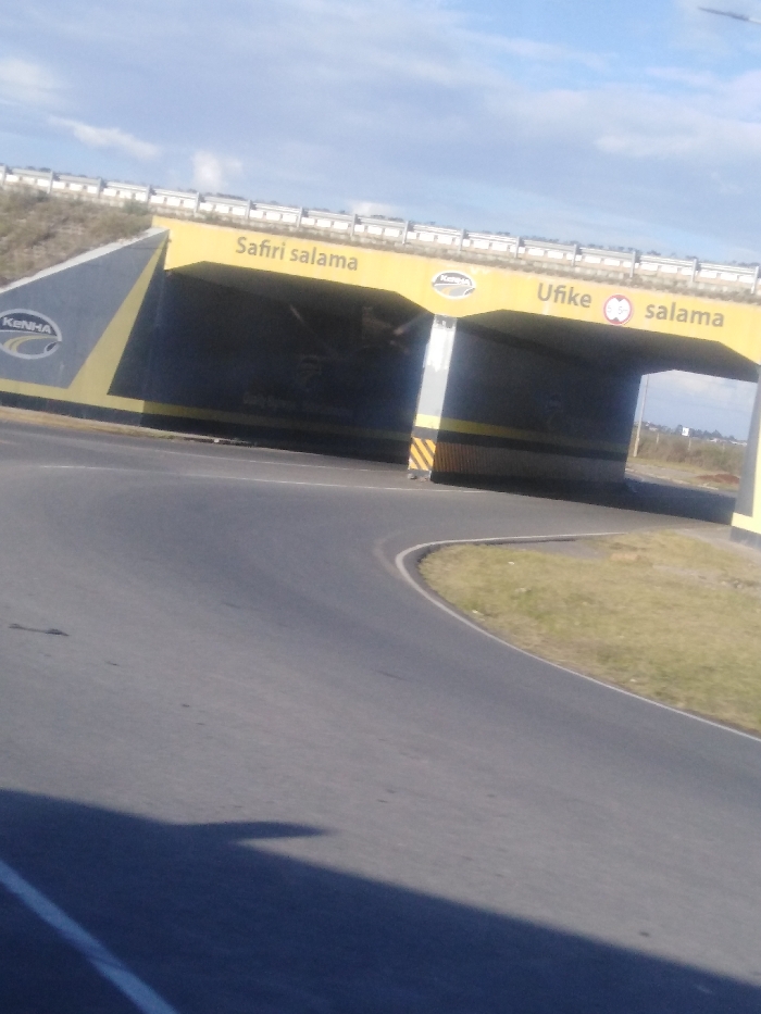 - "A highway overpass spans a curved asphalt road, with the words "Safri Salama" and "Ufike Salama" emblazoned in yellow against a black background, framing either side of the overpass" by FM-15Ydd2, licensed under CC BY 4.0