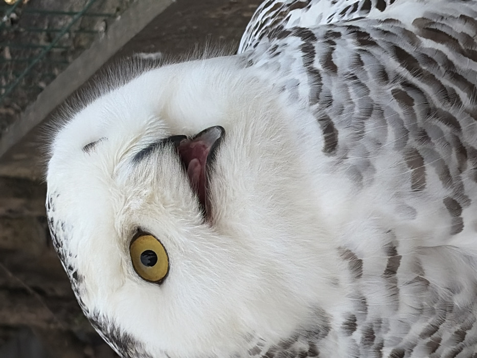 The image displays a close-up, slightly upward-angled view of a snowy owl (Bubo scandiacus). The owl's head is turned slightly to its right, with its bright yellow irises and black pupils clearly visible as it gazes upwards. Its black beak is slightly open, revealing a pink tongue and the interior of its mouth. The plumage is predominantly white, featuring irregular dark brown to black markings and bars visible across its head, back, and more distinctly on the lower neck, chest, and shoulder feathers. The background is out of focus, indistinctly showing brown, grey, and green elements, which include what appears to be a blurred wire mesh fence or enclosure. No visual information within the image allows for the determination of its specific location within the city of Shakhty, Russia, or any other geographic area.