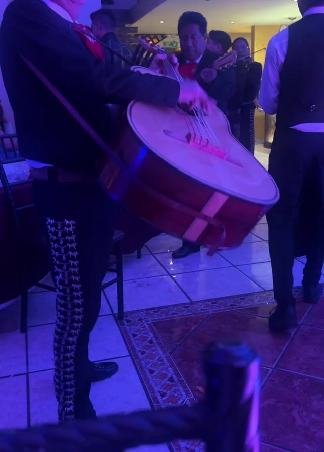 A Mariachi band is playing in a restaurant with blue and purple lighting. A man in a black Mariachi suit with silver horse adornments on the side is playing a large guitar, called a guitarron. Another band member is playing a violin. Other people are in the background, some are in Mariachi suits. The floor is tiled with patterned rugs. There is a chair in the lower left corner.