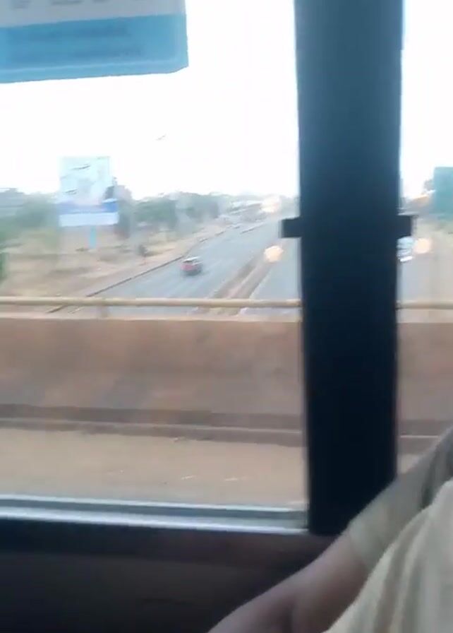 A person is seated next to a window on a bus, which is driving over a bridge. The camera angle is from inside the bus, looking out the window. A highway is visible below. There is a sign above the window with stick figure illustrations indicating priority seating for disabled, elderly and pregnant people. The person is wearing a light-colored shirt and tan pants. There are trees and buildings in the distance.
