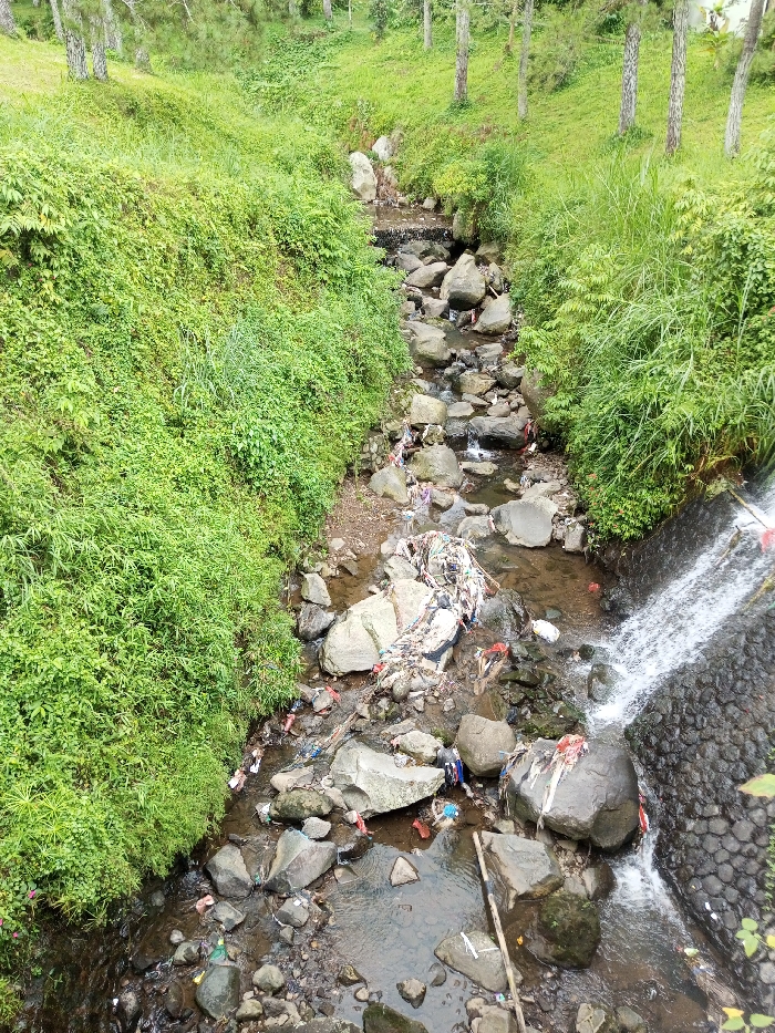 A stream lined with vibrant greenery on the left bank flows downhill through a rocky bed. The stream is heavily polluted with various types of litter, including plastic bags and scraps, tangled amongst the rocks. A small waterfall cascades over a stone structure on the right. The overall scene showcases a natural environment marred by significant pollution.