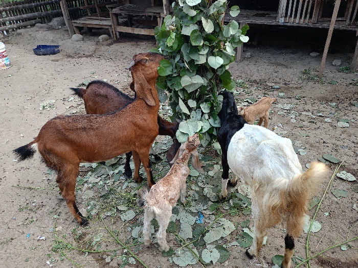 - "A herd of five goats gathers around a leafy branch, actively eating the foliage" by FM-v8vYF3, licensed under CC BY 4.0