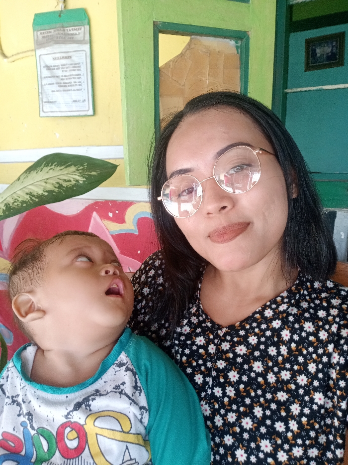 The image displays an adult female and an infant in an indoor or semi-outdoor setting. The female, positioned on the right, has dark, straight hair, wears round gold-rimmed glasses, light brown lipstick, and a black blouse with a white floral pattern. She faces forward, looking directly at the camera with a slight smile. The infant, on the left, has light brown hair and wears a white and teal long-sleeved shirt with colorful lettering. The infant's eyes are rolled upwards and to its right, with its mouth slightly open. The background features a yellow wall on the left, partially obscured by a variegated plant leaf. A green pouch or laminated document hangs on the yellow wall, containing text including the Indonesian word "PERHATIAN" (Attention). Below the leaf, a colorful abstract mural in red, pink, blue, and yellow is visible. On the right side of the frame, a green door or window frame leads to an interior space with a yellow wall and a small framed picture on a darker teal wall. The specific city of the location is unknown, but linguistic cues on the hanging document suggest an Indonesian-speaking region.