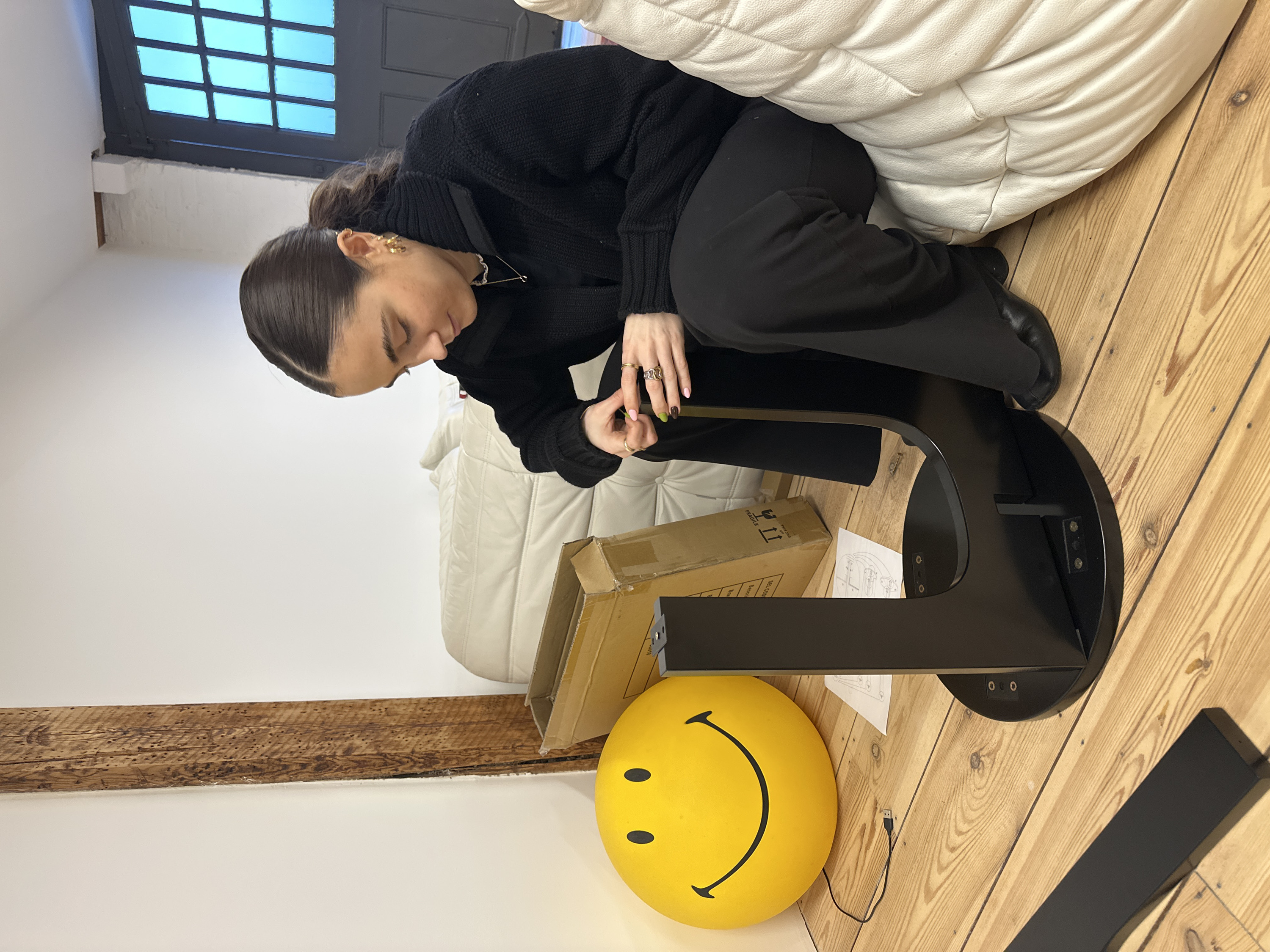 A woman kneels on a wooden floor next to a white cushion. She assembles a black table. A cardboard box and instructions are nearby. A yellow smiley-face lamp sits at the base of the table. The woman wears a black sweater and pants with black shoes. The room is bright, with light coming through a window behind her. A wooden beam runs along the base of the wall.