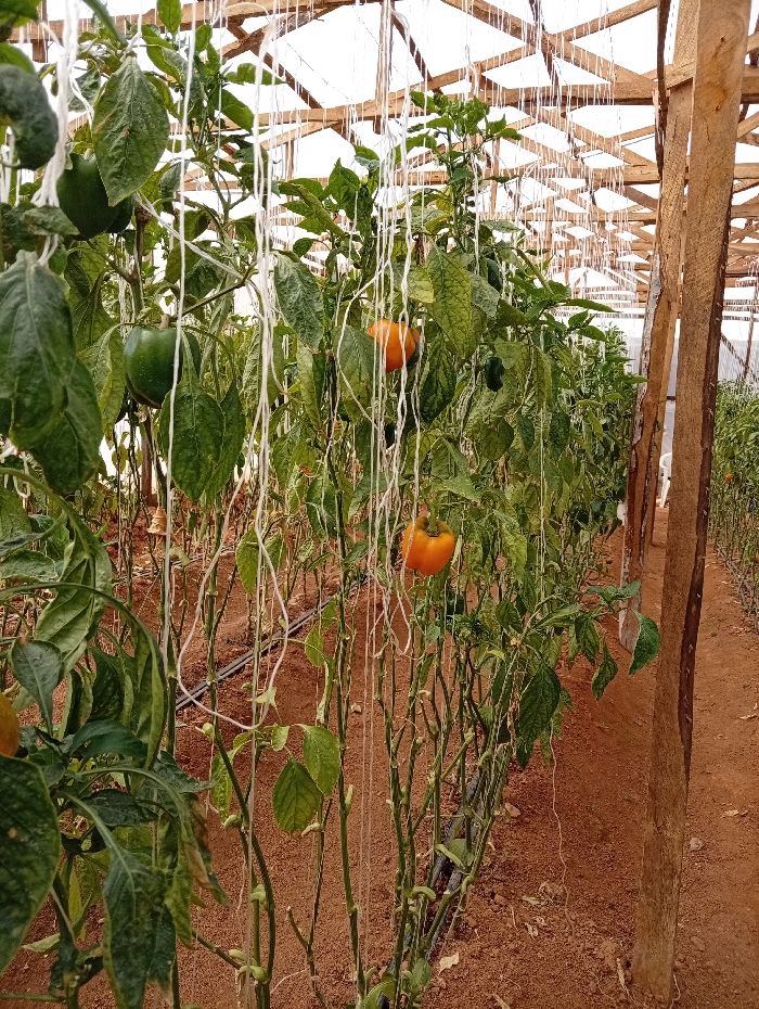 The image displays the interior of a greenhouse facility located in Barakin Lerawi, Nigeria. Rows of pepper plants are cultivated in reddish-brown soil under a translucent roof supported by a wooden framework of posts and beams. Numerous white strings descend vertically from the overhead structure, providing support for the growing plant stems. Visible fruits include two prominent green peppers in the left foreground and two prominent orange peppers in the mid-ground, indicating different stages of ripeness. The plant foliage is green. Thin black irrigation tubing runs along the soil surface near the base of the plant rows. No individuals are present in the scene.