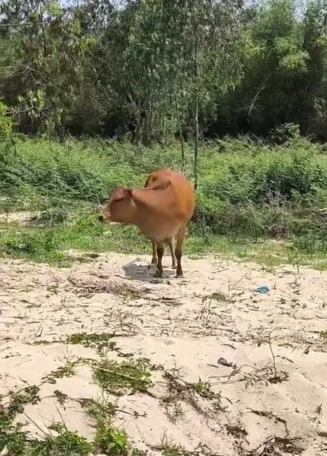 brown cow standing in a sandy, grassy field. In the background, there are green trees and shrubs. The cow is facing the camera and looks directly at the viewer. The environment appears to be a rural or semi-rural area.