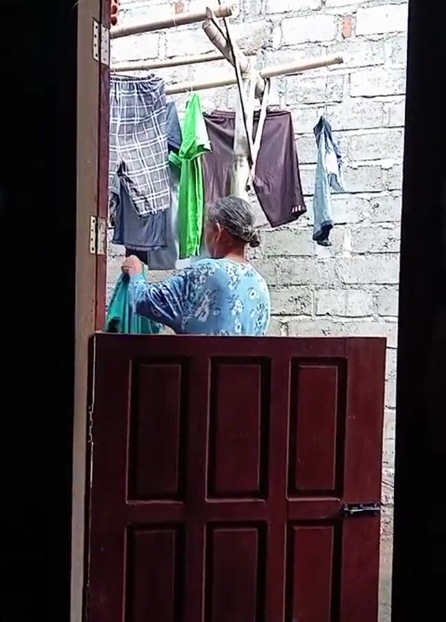 The video, shot from indoors, features a person from the back hanging up laundry outside. The person has gray hair pulled into a bun and is wearing a blue floral top. Clothes are strung on a bamboo pole, including a gray plaid garment, a green cloth, brown shorts, and a blue item. The clothesline is set against a cinder block wall. The perspective is framed by a dark red door with rectangular panels. The door is open, and the room from which the video is shot is dark.