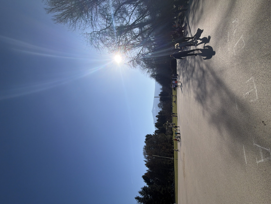 The image depicts an outdoor scene at the Kambanite Park (Children's Assembly "Banner of Peace" complex) in Sofia, Bulgaria, on a clear, sunny day. The snow-capped Mount Vitosha is visible on the distant horizon. In the foreground, a large, light grey paved area stretches across the lower half of the frame. Faint white chalk markings, including geometric shapes and partial letters (e.g., a "V" and a rectangular outline on the left, an "E" on the right), are visible on this surface. Long, distinct shadows of people and trees are cast across the paved area, originating from the strong sunlight entering from the upper right, which also produces prominent lens flare. In the middle ground, on the right side of the paved area, a group of approximately 8-10 individuals, mostly adults, walk from left to right, their backs generally to the camera. One individual appears to be pushing a stroller. Towards the center-left, another smaller group of approximately 5-7 people, including children, are gathered, some with bicycles or scooters. Beyond the paved area, a grassy park is visible, bordered by numerous trees. Dark green coniferous trees are prominent on the left, while deciduous trees with bare branches line the right side. In the center-left of the park, a distinctive "Flying Saucer" or "Mushroom" shaped monument, identified as part of the "Bells Monument" complex, is visible. Two tall flagpoles stand without flags. Several other dispersed individuals are present in the grassy areas. The sky is a bright, cloudless blue, indicating excellent weather conditions.
