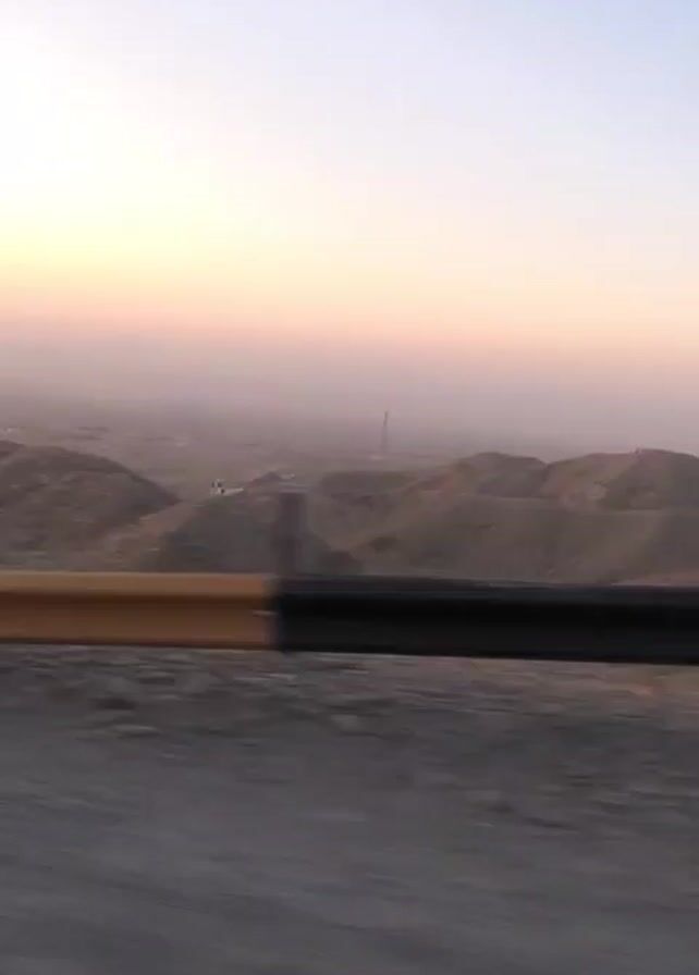 landscape under a dusky sky. The foreground includes a paved road with a black and yellow guardrail running along its side. Beyond the guardrail, the terrain is dry and hilly. In the distance, the horizon is blurred by what appears to be mist or haze, with a hint of orange and pink from the sunset. In the very first frame, an out-of-focus cell phone tower is visible in the distance. The camera is moving, as the landscape shifts as the video progresses.