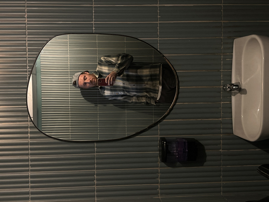 - "The image displays a mirror selfie of a male individual within an indoor setting, likely a public restroom, characterized by ridged, vertically aligned teal-colored wall tiles" by FM-8YKLB2, licensed under CC BY 4.0